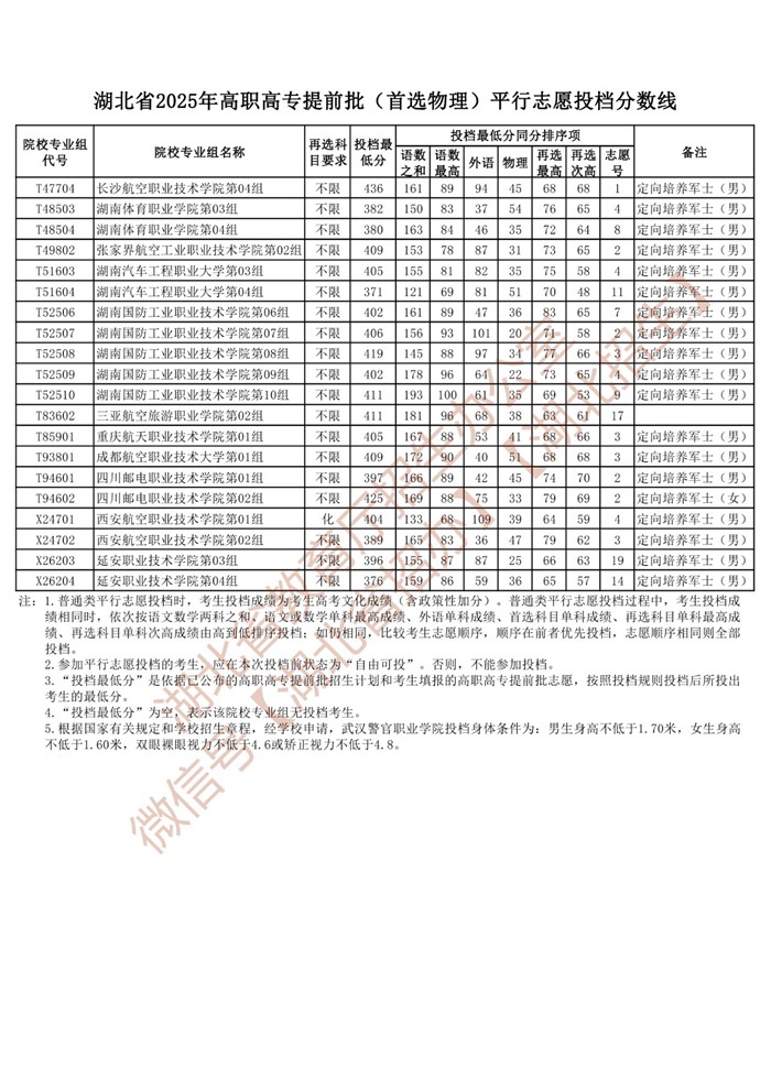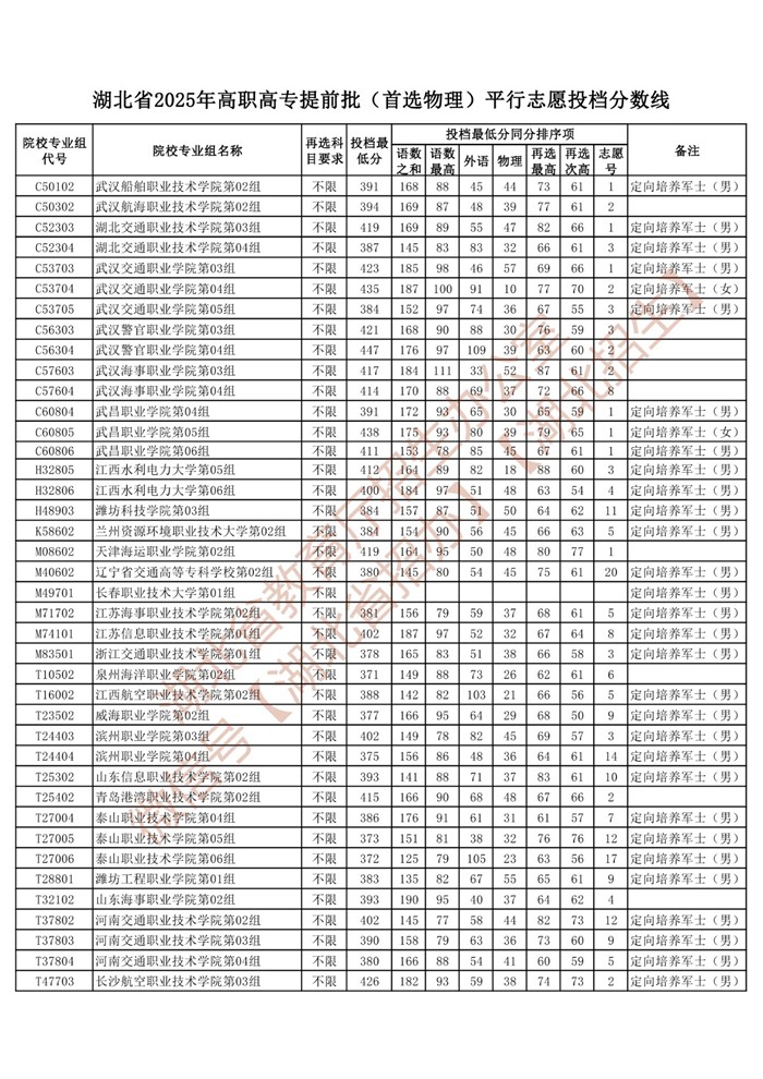 湖北省2025年高职高专提前批(首选物理)平行志愿投档分数线已公布在湖北省教育厅官网“高校招生”专栏,考生可点击下方图片放大查看。