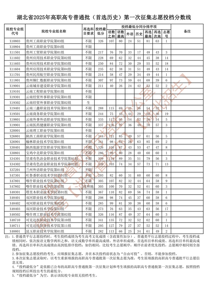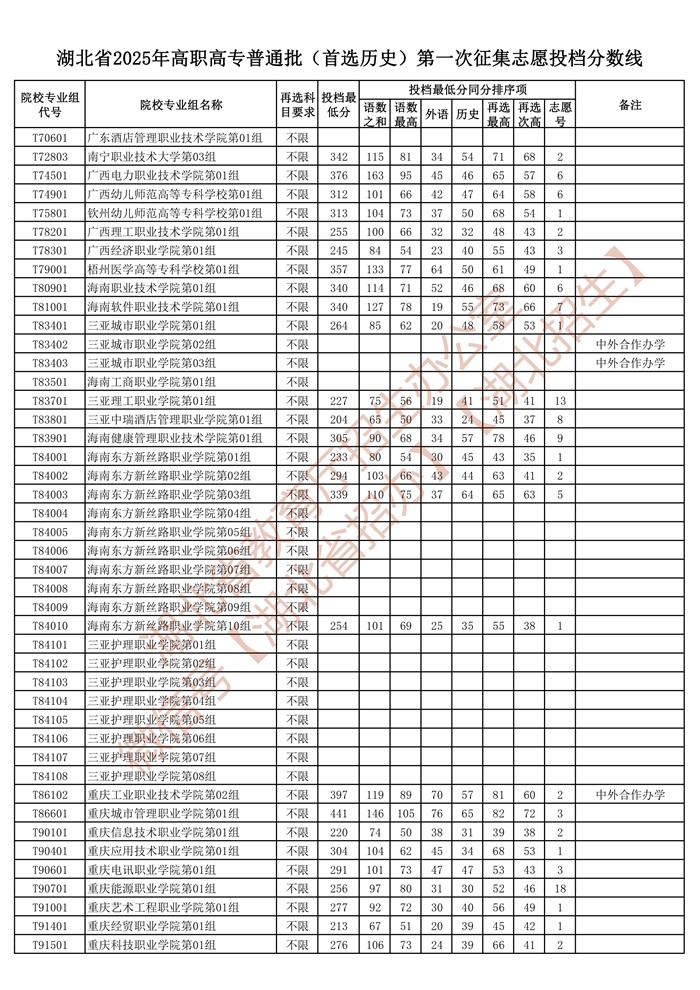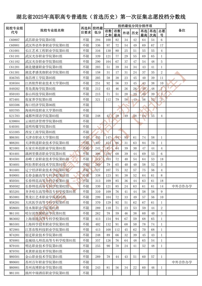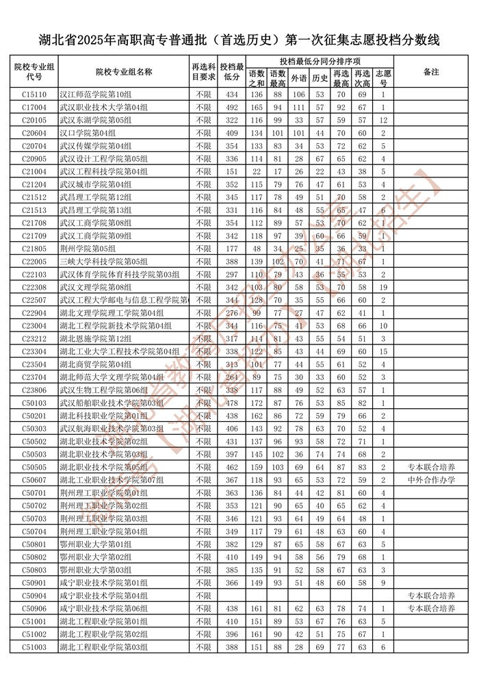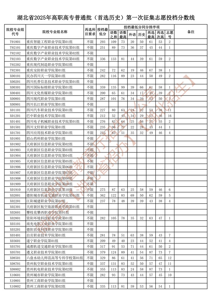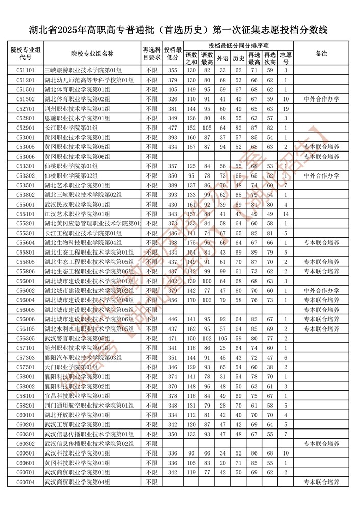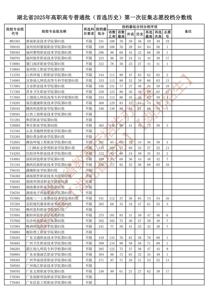 湖北省2025年高职高专普通批(首选历史)第一次征集志愿投档分数线已公布在湖北省教育厅官网“高校招生”专栏。