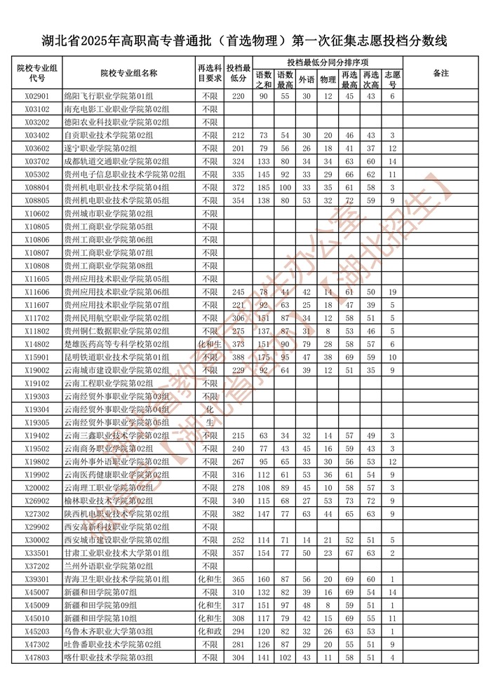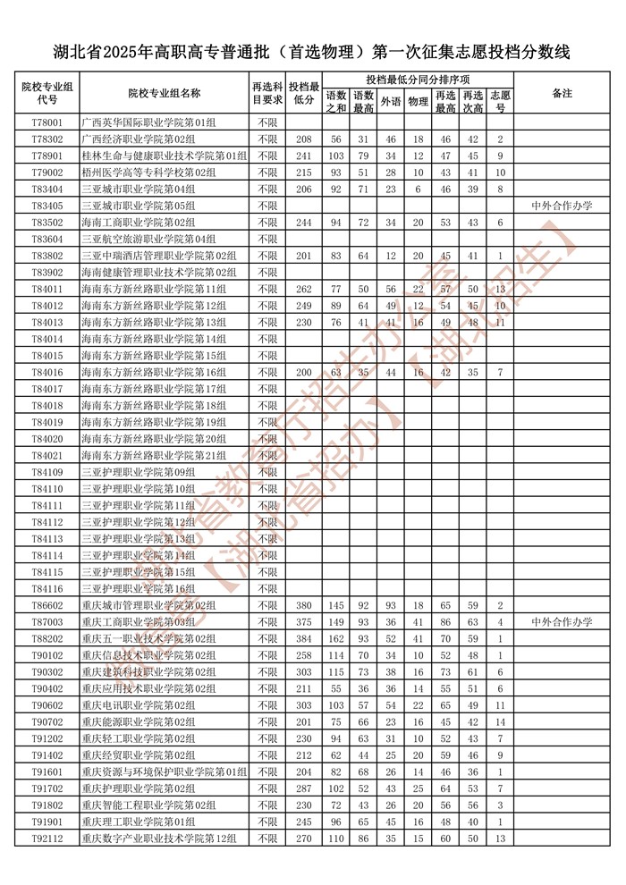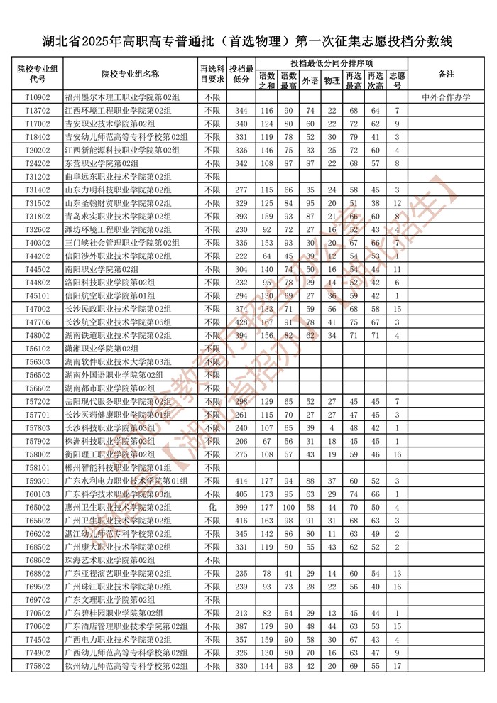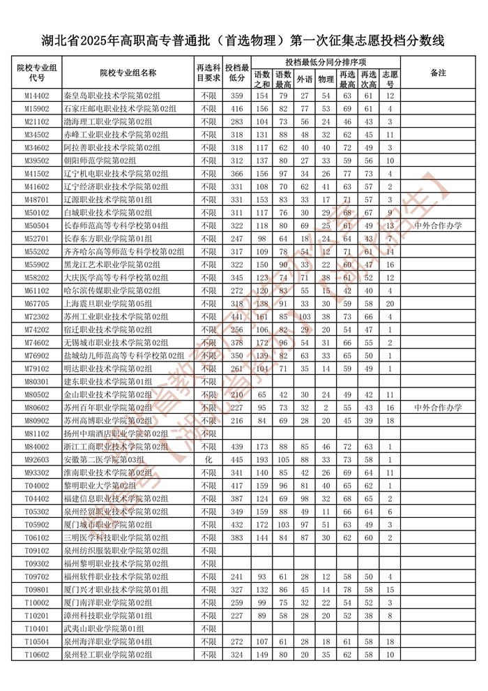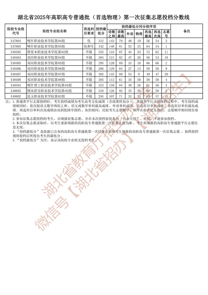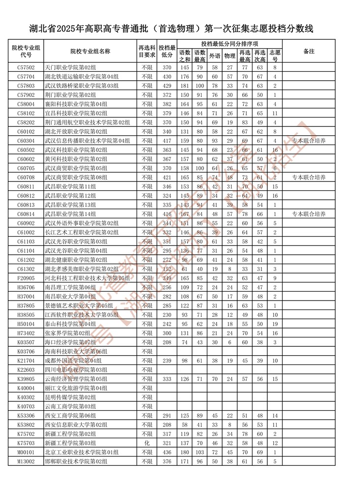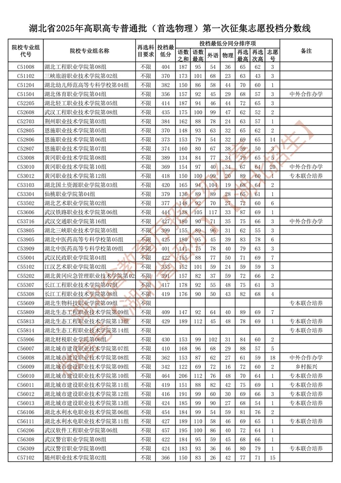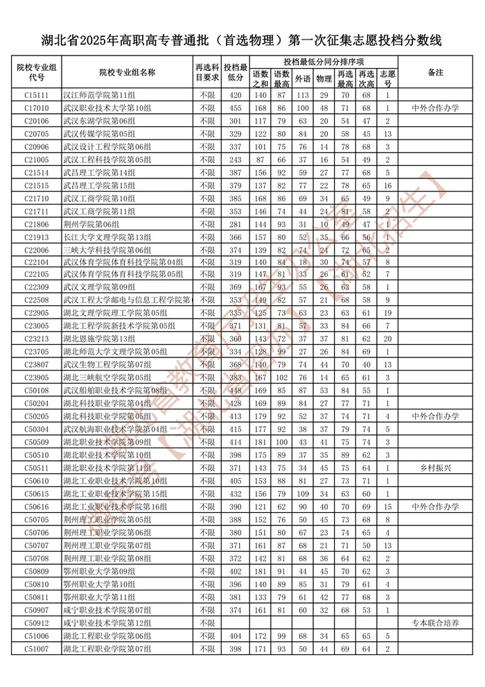 湖北省2025年高职高专普通批(首选物理)第一次征集志愿投档分数线已公布在湖北省教育厅官网“高校招生”专栏。