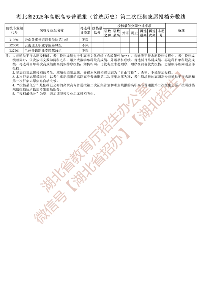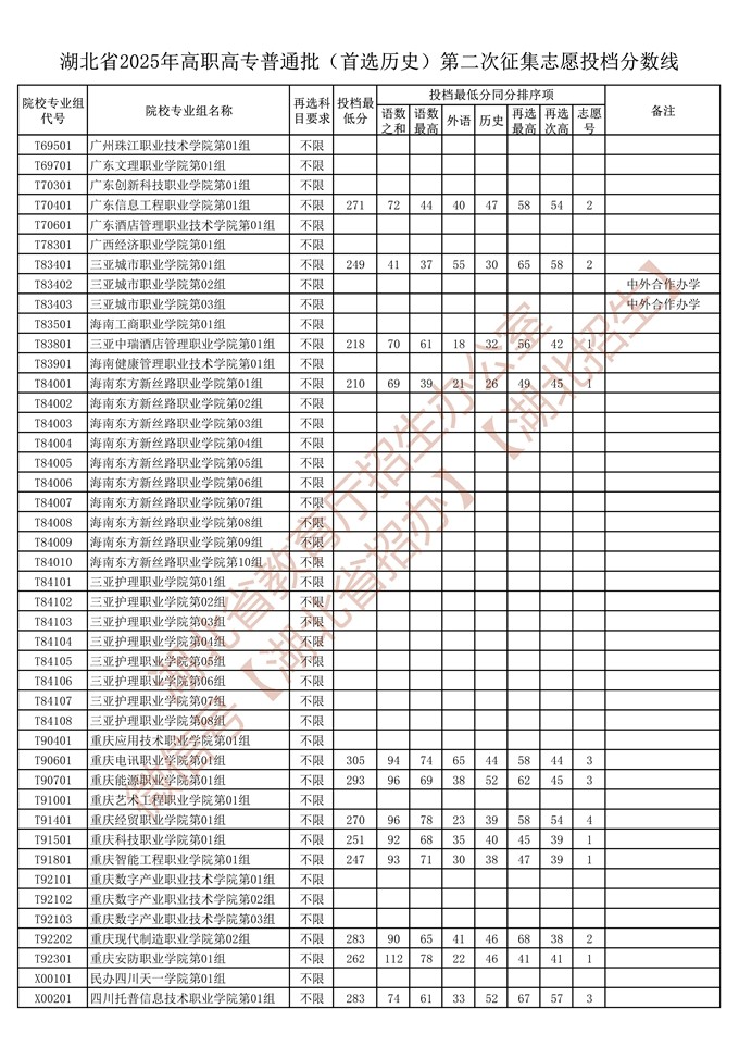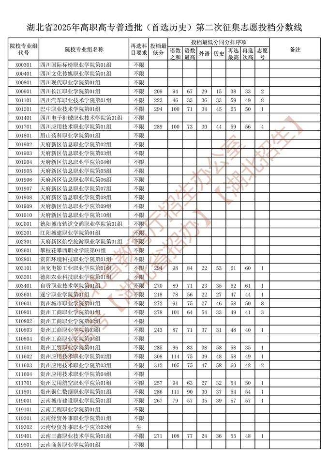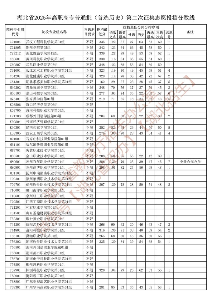 湖北省2025年高职高专普通批(首选历史)第二次征集志愿投档分数线